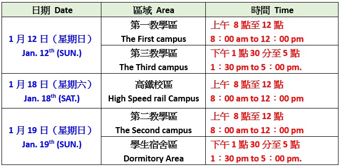 受文者:第一、第二及第三教學區、宿舍區及高鐵校區各使用及管理單位
