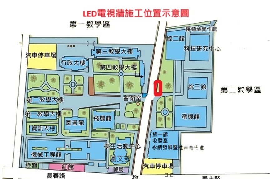主旨:本校第二校區校門出口旁之「LED電視牆汰換工程」施工,施工期間有大型吊車及工程車輛進出,禁止於施作管制區域周圍逗留(詳位置圖紅框處),並請校內行車注意停放位置及車輛安全。特此公告週知,造成不便之處,敬請諒察!